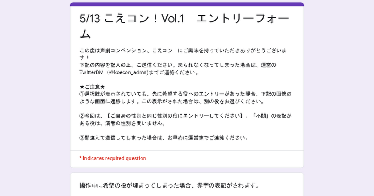 この度は声劇コンベンション、こえコン!にご興味を持っていただきありがとうございます!下記の内容を記入の上、ご送信ください。来られなくなってしまった場合は、運営のTwitterDM(@koecon_admn)までご連絡ください。★ご注意★①選...