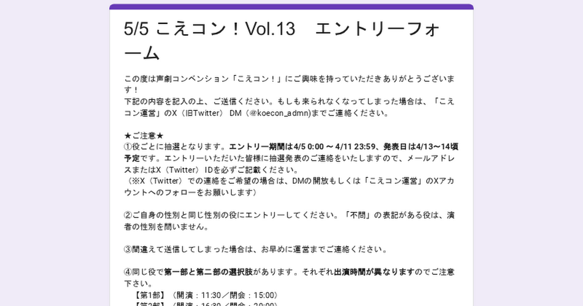 - 「こえコン! Vol.13 ~in 人形町~」は二部制で開催します。第1部・第2部ともに主な上演作品は共通とし、参加者入れ替え制となります。