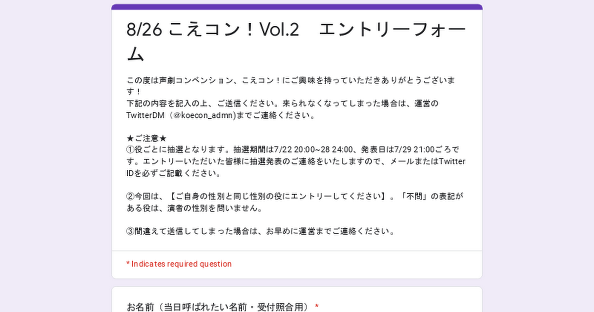 この度は声劇コンベンション、こえコン!にご興味を持っていただきありがとうございます!下記の内容を記入の上、ご送信ください。来られなくなってしまった場合は、運営のTwitterDM(@koecon_admn)までご連絡ください。★ご注意★①役...