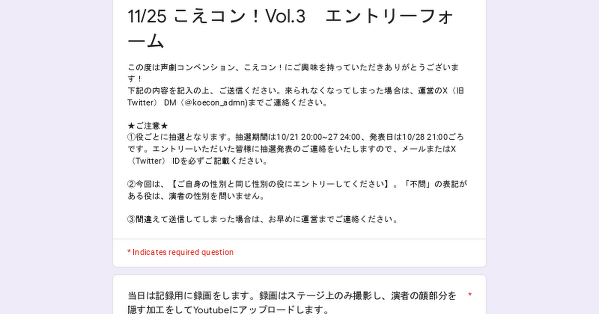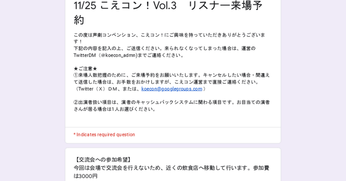 この度は声劇コンベンション、こえコン!にご興味を持っていただきありがとうございます!下記の内容を記入の上、ご送信ください。来られなくなってしまった場合は、運営のX(旧Twitter) DM(@koecon_admn)までご連絡ください。★ご...
