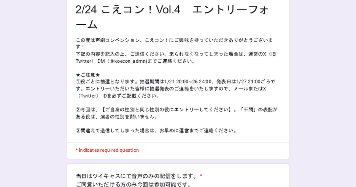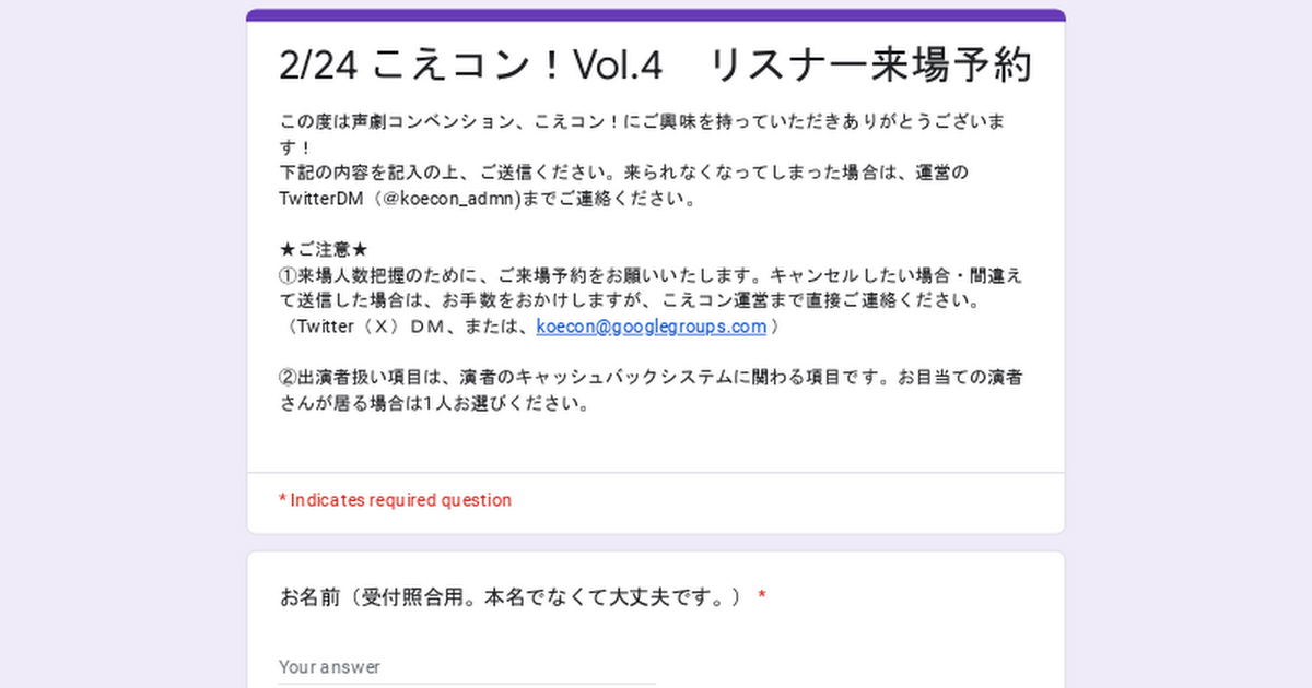 - 演者エントリー終了後より、リスナー枠が満席になるまで「リスナー予約フォーム」を公開します。来場ご予約時に「誰扱いか(=誰のリスナーか)」を選んでいただきます。(扱い無しも選択可能)