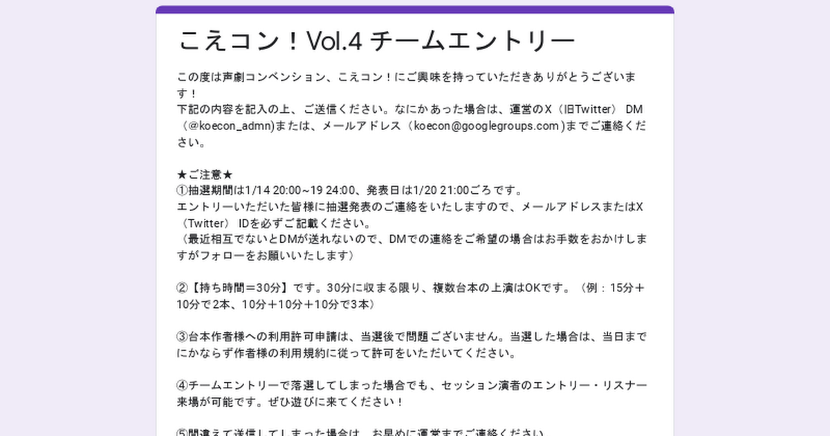 - 上演するシナリオについて、入場料のある企画なので有償利用に当たる可能性があります。シナリオ作者様の利用規約を確認し、必要があれば台本の上演許可を取ってください(もちろん上演するシナリオの作者本人がチームとして参加する場合はその限りではありません)。