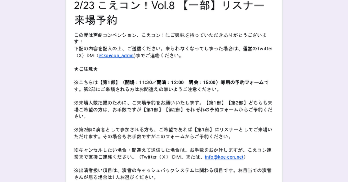 - リスナー予約フォームは第1部用と第2部用がそれぞれございます。ご来場されるお時間を確認したうえでご予約ください。