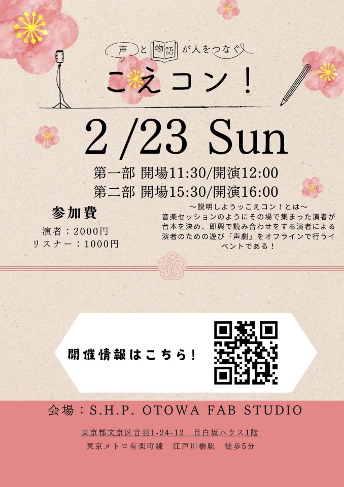 - 「こえコン! ~in 江戸川橋~」は二部制で開催します。第1部・第2部ともに主な上演作品は共通とし、参加者入れ替え制となります。